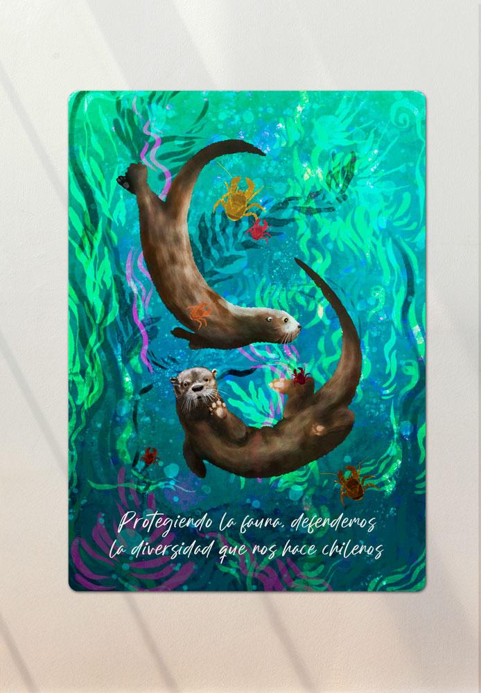 Diseñado para quienes se identifican con sus frases y con un espíritu conectado al cuidado del medioambiente, la naturaleza y la vida simple. Este cartel esta inspirado la protección de la diversidad de nuestro país y el planeta, interpretado por dos bellos huillines disfrutando de su habitat.