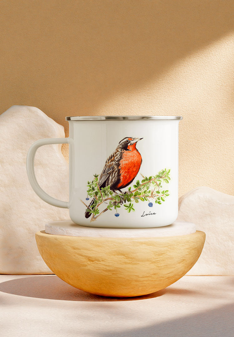 Hermoso tazón enlozado, ideal para excursiones, campamentos o decorar tu cocina ¡Arma tu colección! El esmalte también es un excelente conductor de calor, por lo que nuestro tazón mantendrá tus manos calientes incluso en los días más fríos. Ilustrado e impreso por Hoja de Parra Deco.