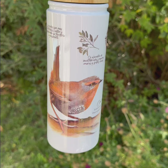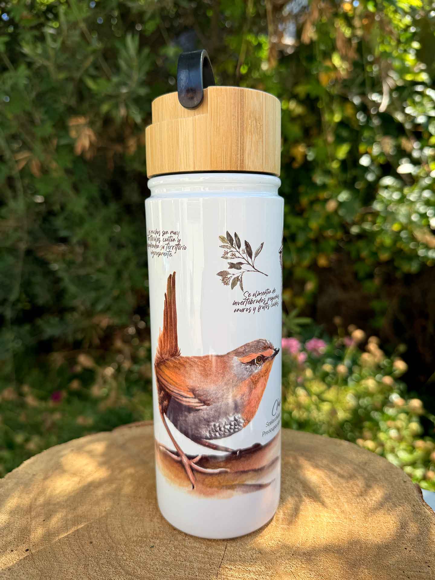 Termo individual con doble pared aislante de acero inoxidable y tapa de madera de bambú con asa para llevar cómodamente en tus manos, ideal para tus actividades diarias.